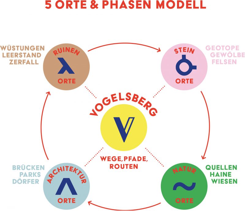 Der Audiowalk basiert auf dem künstlerisch-philosopischen Gedankenkonstrukt des „5 Orte&PhasenModells“ des Vogelsberger Künstlers und Architekten Michael Ruhl. Das Modell orientiert sich eng an der Entstehung der einzigartigen Vulkanlandschaft des Vogelsberges (größte, zusammenhängende Basaltmasse in Mitteleuropa). Es beschreibt den Kreislauf verschiedener Phasen und Orte, die in jeder Gemeinde der Region als verbindende und wiederkehrende Strukturen unterschiedlicher Dimensionen (geographisch, geschichtlich, etc.) vorgefunden werden können. So gibt es in jeder Gemeinde stets Steinorte, Naturorte, Architekturorte und Ruinenorte. Die Wege zwischen diesen Orten sind als fünfter Ort & fünfte Phase zu verstehen und stellen das verbindende Element dar.